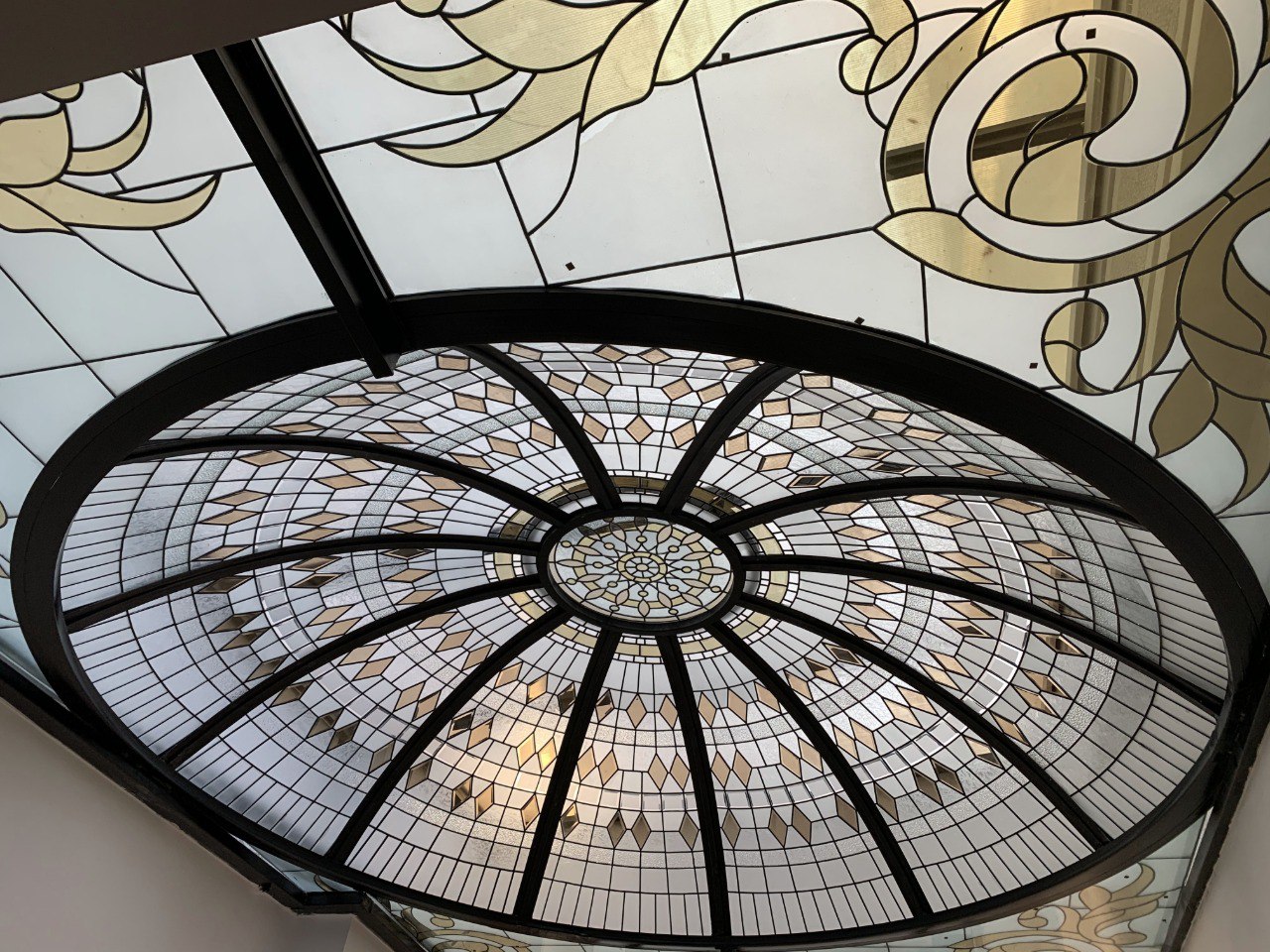 The combination of modern stained glass and meticulous design has made this ceiling a unique artistic element in the interior space.
