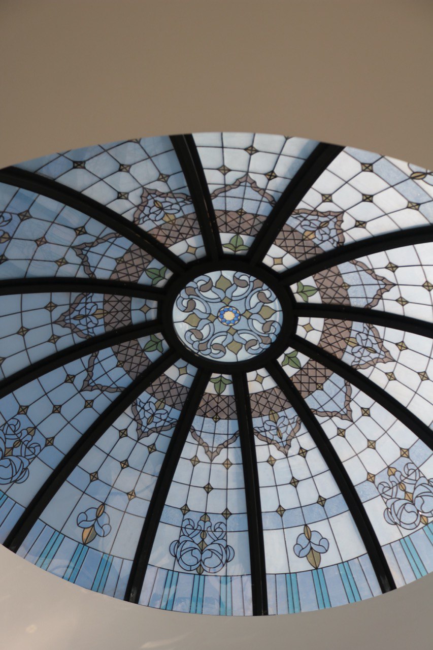 قطر این گنبد در حدود ۳.۵ متر میباشد. طراحان با الهام از ریتمهای تکرارشوندهی معماری پروژه، فرمی خلق کردهاند که همراستا با سبک کلی ساختمان در فضا مینشیند و نقوش بهکاررفته در شیشهها را بهخوبی با سازه هماهنگ کردهاند.